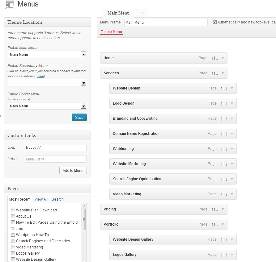 If you are adding a key page to your website, such as “About Us”, in most cases the page will be added to the top menu automatically. However, if you are placing a secondary page, such as “Qualifications”, you will need to manually add that to the menu.